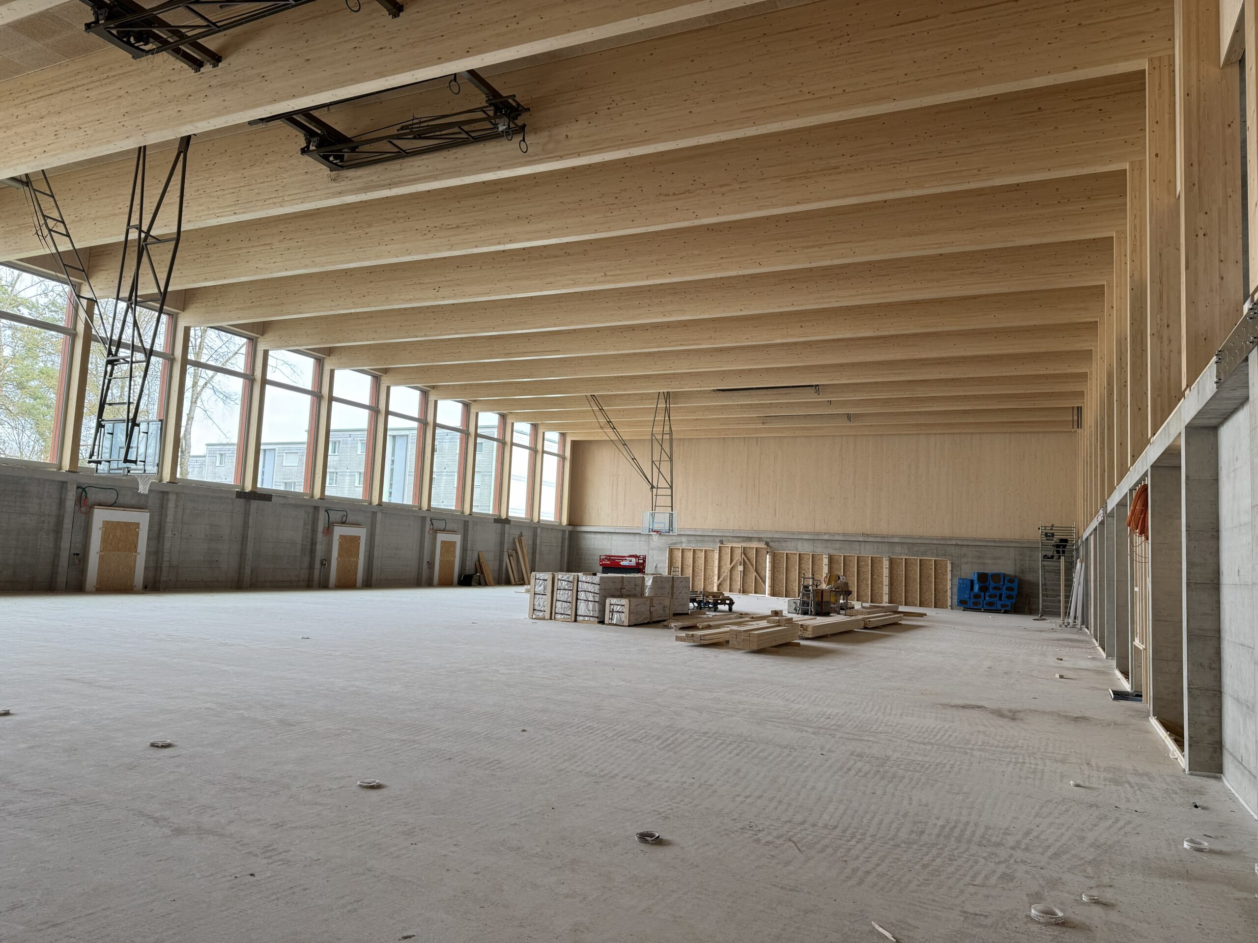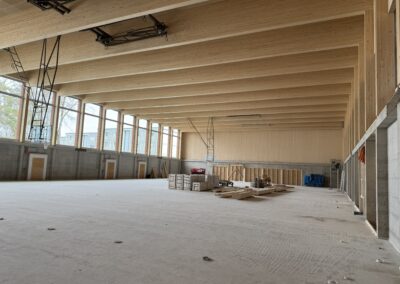 In der ersten Bauphase erfolgen die Erstellung des neuen Schulgebäudes und der neuen Dreifachsporthalle. Die Rohbauarbeiten und die Montage der vorgefertigten Fassadenelemente aus Holz sind demnächst abgeschlossen.