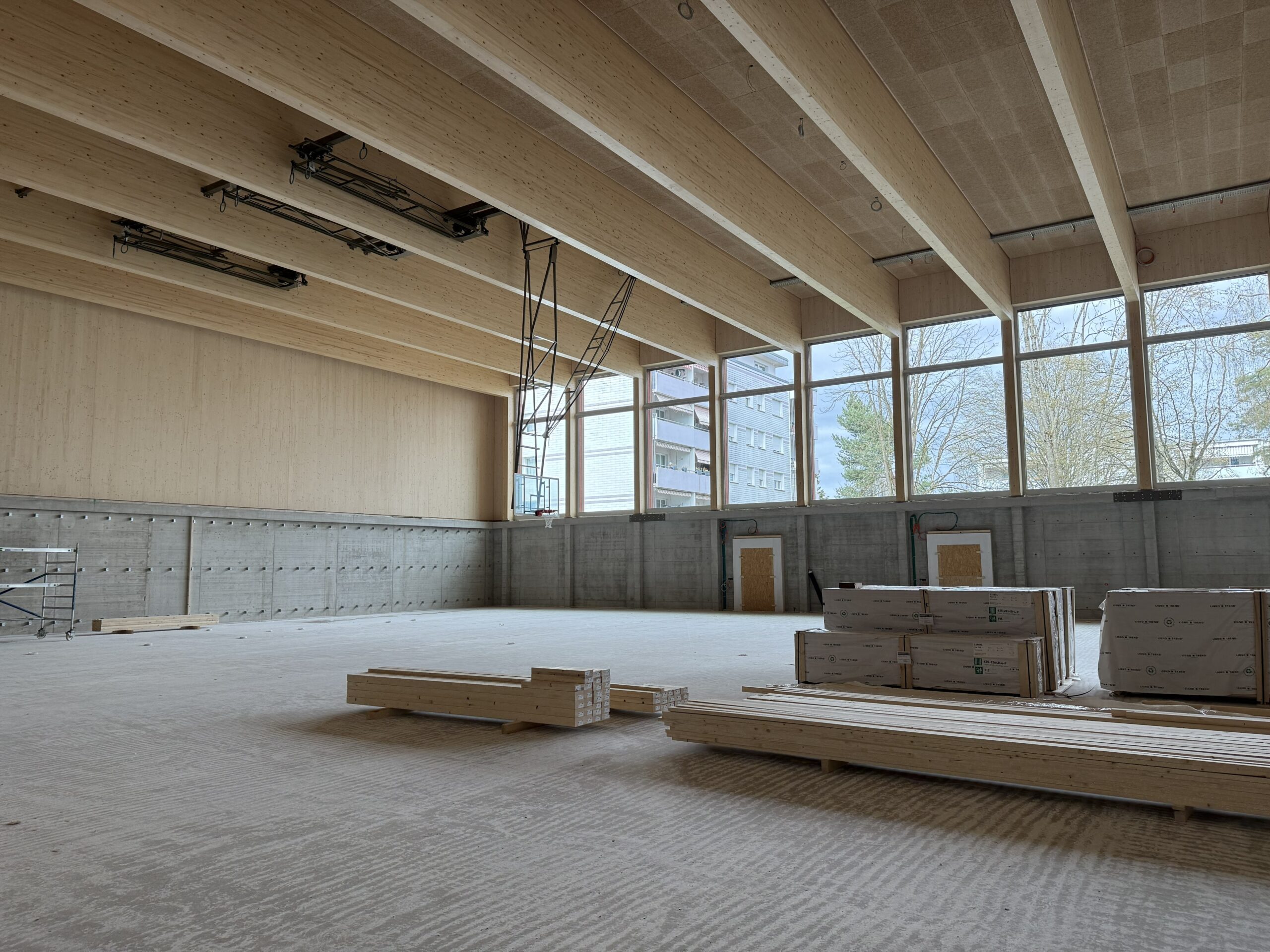 Im ersten Halbjahr 2026 erfolgen der Innenausbau des neuen Schultrakts und der Dreifachsporthalle. Nachfolgend erfolgen die Sanierung des Bestandbaus sowie die Umgebungsarbeiten bzw. die Gestaltung des Aussenraums.